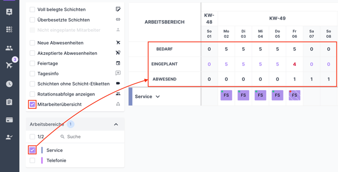 Gehen Sie dafür zunächst in einen beliebigen Schichtplan und rufen links die Filter auf. Durch die Filteroption "Mitarbeiterübersicht" haben Sie die Möglichkeit, auf einen Blick sehen zu können, ob die Bedarfe auf den Schichten gedeckt sind. So wird Ihnen tageweise in Zahlen zunächst der Bedarf aller Schichten an diesem Tag angezeigt und dazugehörig die Anzahl der zugewiesenen Mitarbeitenden und der abwesenden Mitarbeitenden.
