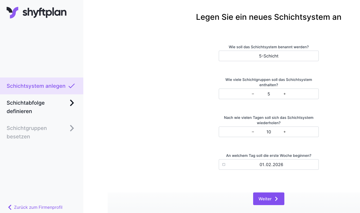 HINWEIS: Wir empfehlen, das Startdatum auf einen Montag in der Vergangenheit zu legen. Damit startet die Schichtabfolge immer an einem Montag.
