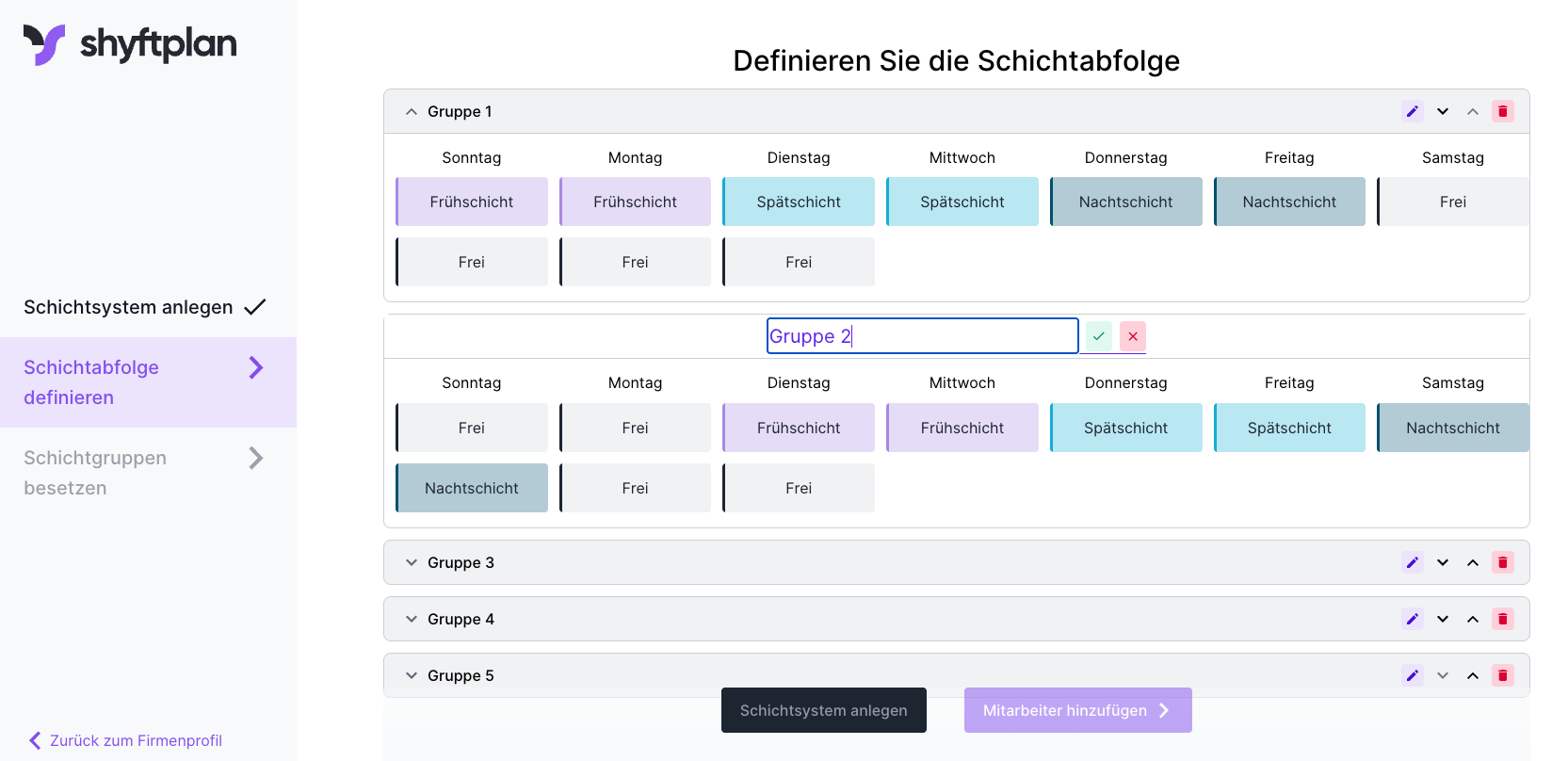 HINWEIS: Sobald Sie das Schichtsystem angelegt haben, kann die Schichtabfolge der bereits bestehenden Gruppen nicht mehr verändert werden. Sie können jedoch weitere Gruppen mit anderen Schichtabfolgen hinzufügen.