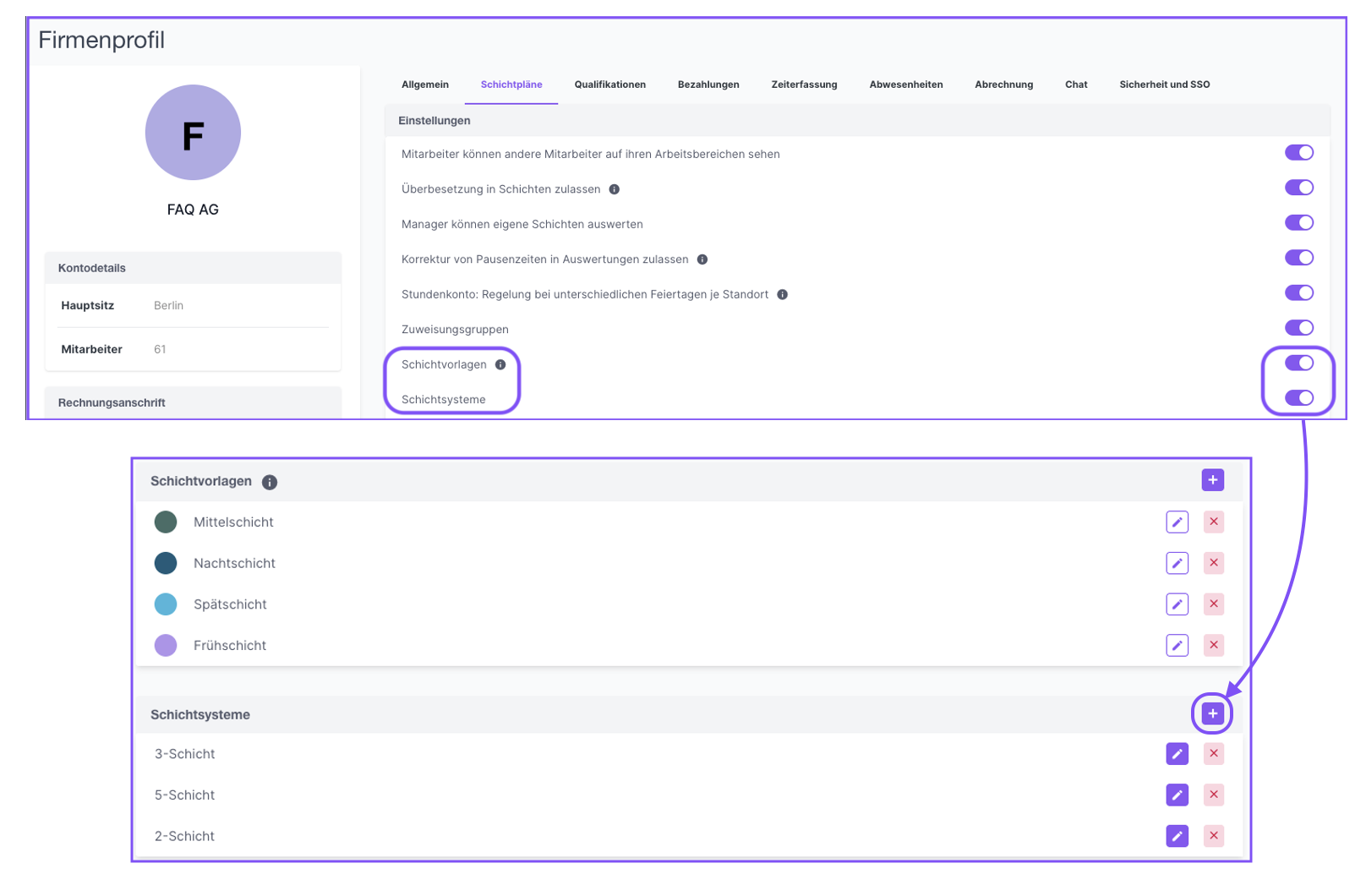 Die Anlage der Schichtgruppen erfolgt im Firmenprofil unter „Schichtpläne“ und setzt voraus, dass bereits Schichtvorlagen existieren.