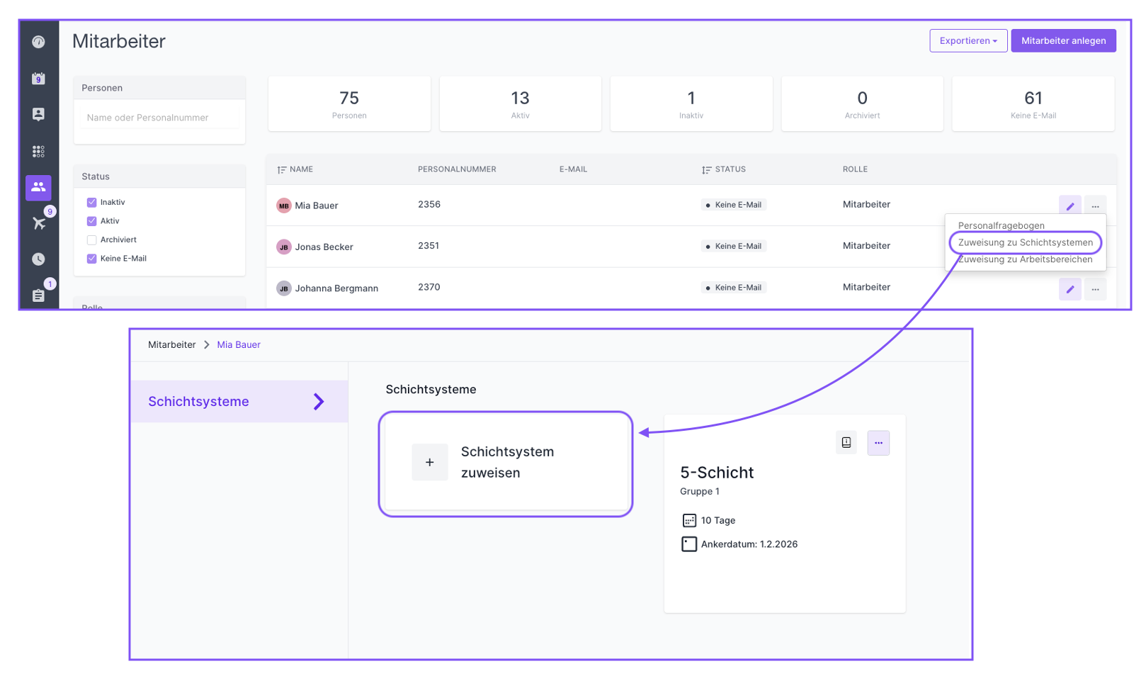 Mithilfe des Schichtsystems können Sie Schichtpläne schneller erstellen und die Mitarbeitenden auf die gesamte Zeit ihrer festgelegten Schichtabfolge zuweisen.