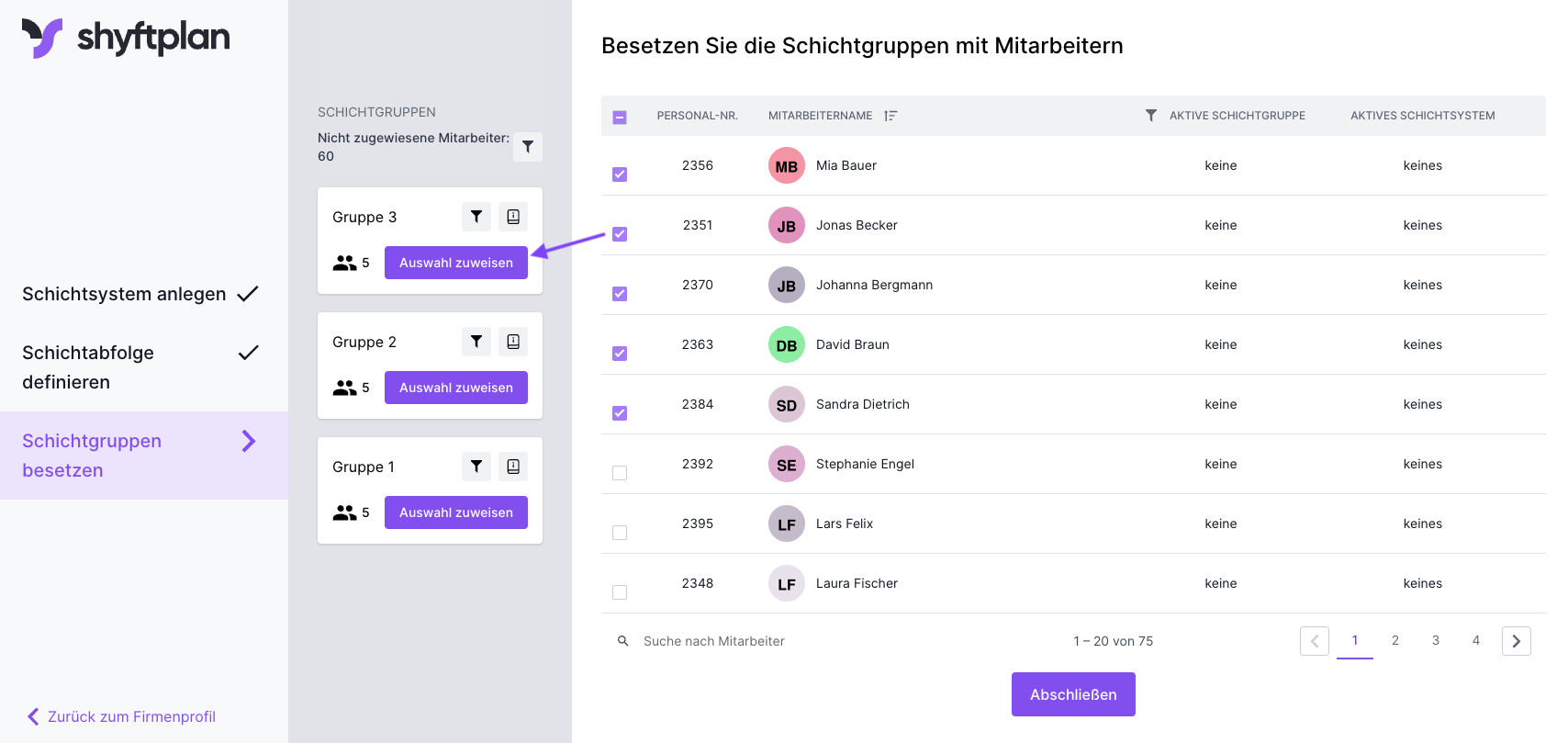 Unter „Schichtgruppen besetzen“ werden schließlich die Mitarbeiter:innen der jeweiligen Schichtgruppen zugewiesen. Das bedeutet, dass sie in der zur Gruppe gehörigen Schichtabfolge Schichten zugeteilt werden können.