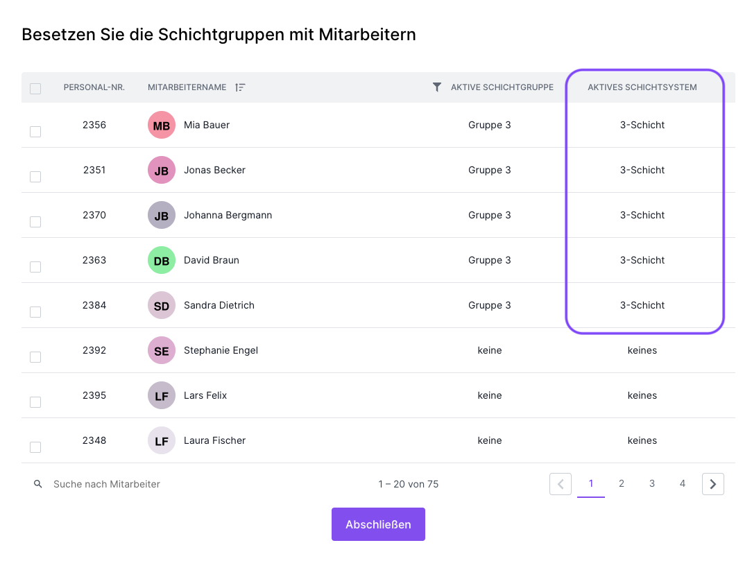 Wenn Sie nun das Schichtsystem Assistent abschliessen, haben Sie ein Schichtsystem erstellt, welche Sie fortan zur Erstellung von Schichtplänen bzw. deren Befüllung nutzen können. Sie können die Erstellung des SChichtsystems auch ohne Zuweisung der Mitarbeitenden abschließen und dies dann zu einem späteren Zeitpunkt nachholen. Zudem können Sie auch einzelnen Mitarbeitenden Schichtgruppen im Mitarbeiterprofil zuweisen oder die bestehende Schichtsystemzuweisung bearbeiten.