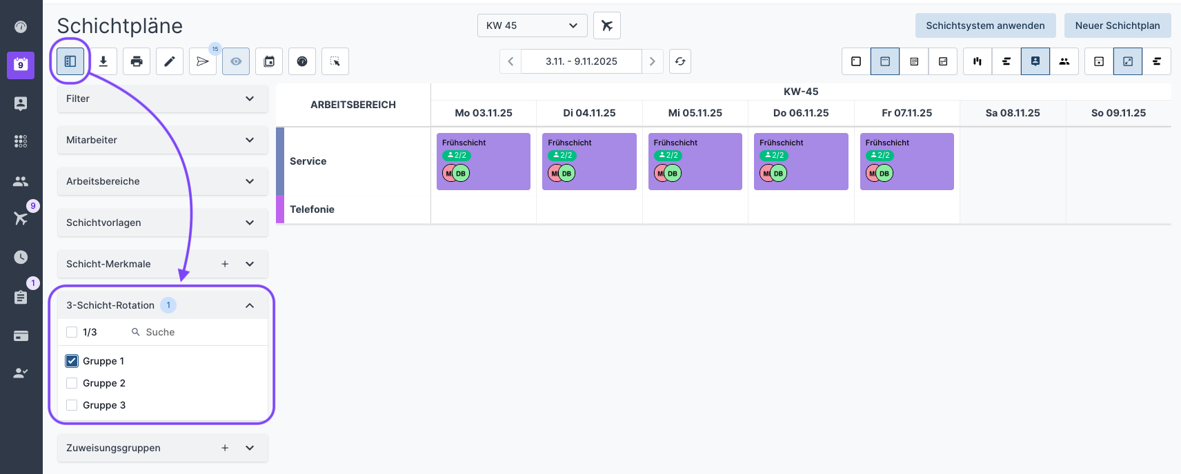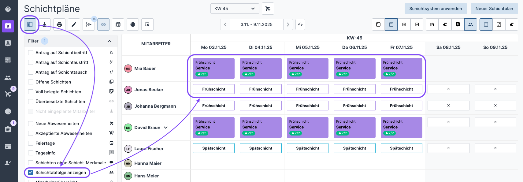 Um Mitarbeitende nun auf Schichten entsprechend ihrer Schichtgruppe zuweisen zu können, können Sie sich per Filter in der Mitarbeiteransicht des Schichtplans die Schichtabfolgen anzeigen lassen: