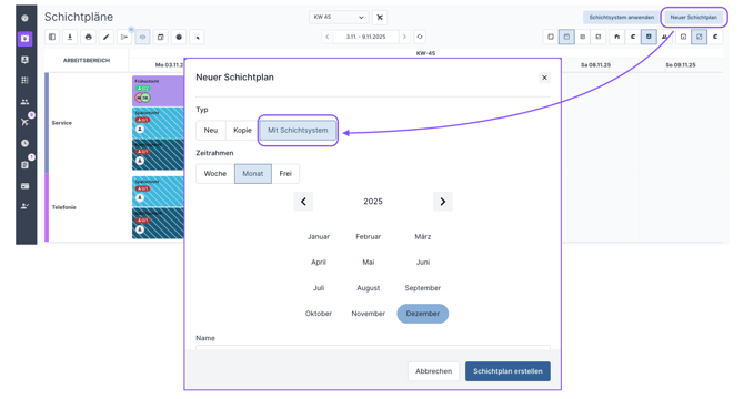 Wenn Sie Schichtpläne mittels zuvor definiertem Schichtsystem erstellen möchten, haben Sie dafür zwei Möglichkeiten.