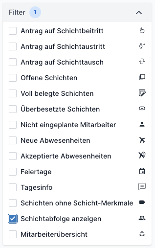 Ein Filter wurde aktiviert, sodass der/die Mitarbeiter:in nicht erscheint, da es entweder einen Abwesenheits- oder Schichtkonflikt gibt. In diesem Fall empfehlen wir die Filter links zurückzusetzen.Wie kann ich die Schichtabfolge für einzelne Mitarbeiter:innen im Schichtplan sehen?