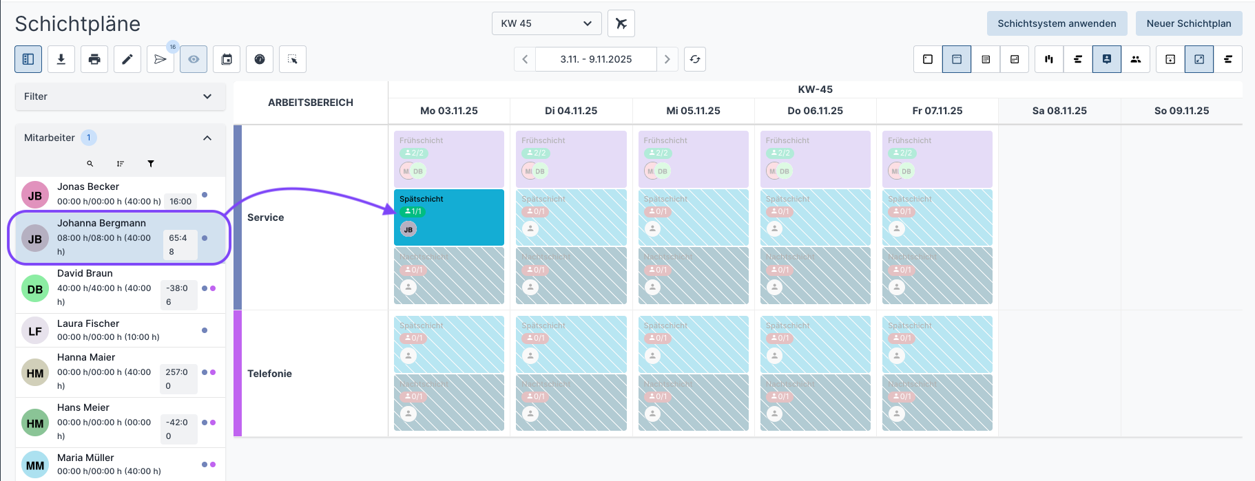 1. Sie suchen sich den/die Mitarbeiter:in aus der Liste links neben dem Schichtplan aus und ziehen ihn/sie per Drag&Drop auf die Schicht, d.h. Sie klicken mit der linken Maustaste auf den/die gewünschte/n Mitarbeiter:in, halten die Maustaste gedrückt und lassen über der gewünschten Schicht wieder los.